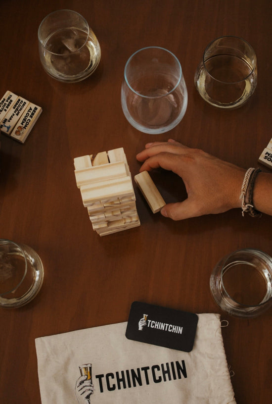 Fazer o desafio da peça; Sempre que a peça "Deita no Copo" sair, deitar bebida no copo grande; Quem derrubar a torre bebe o copo grande de penálti.