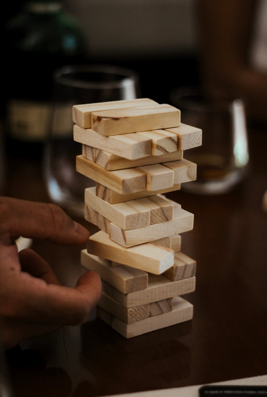 Decides uma ordem, montas a torre e tens de tirar 1 peça de cada vez sem derrubar a torre!